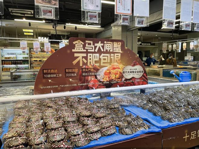 右安门附近的盒马鲜生店内,与大闸蟹产品相匹配的便是盒马鲜生自有品牌产品“盒马臻五年绍兴花雕酒”。据了解,此前盒马曾推出两款黄酒产品分别为“螃友”“臻五年绍兴花雕酒”。盒马方面曾表示,“臻五年绍兴花雕酒”是盒马首款定位常规的黄酒产品。走访过程中,北京商报记者在盒马鲜生多家门店均未找到“螃友”产品。